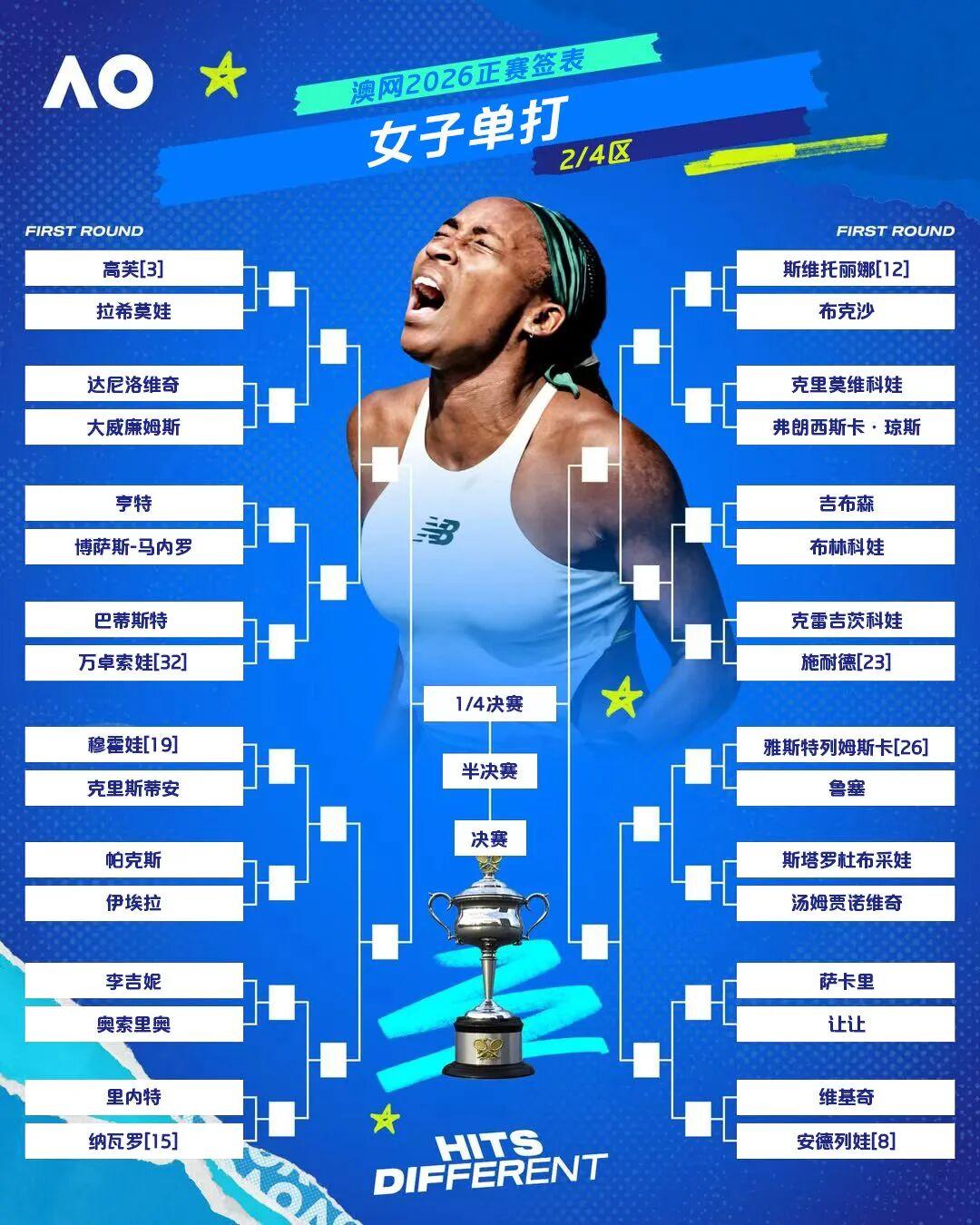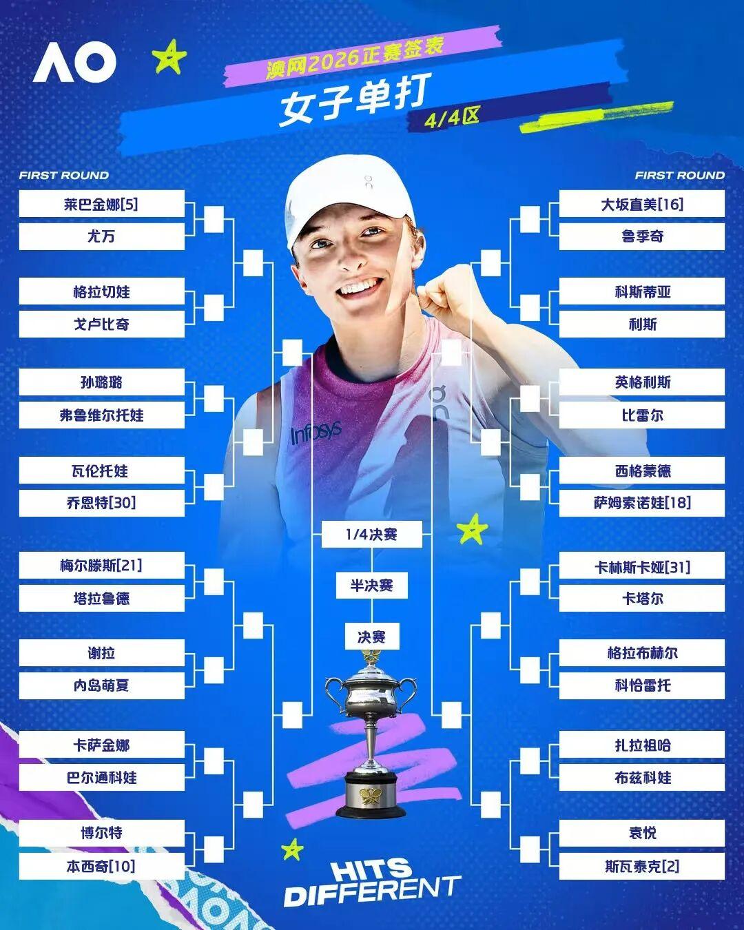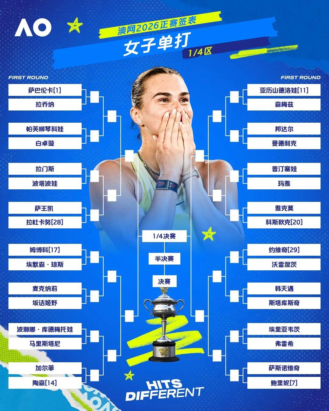 刚刚拿下布里斯班冠军的萨巴伦卡在半决赛前的潜在晋级之路:拉齐纳、帕夫柳琴科娃、拉杜卡努、陶森、保利尼,对于总能在澳洲表现优异的她来说,感觉不是什么太大的问题。