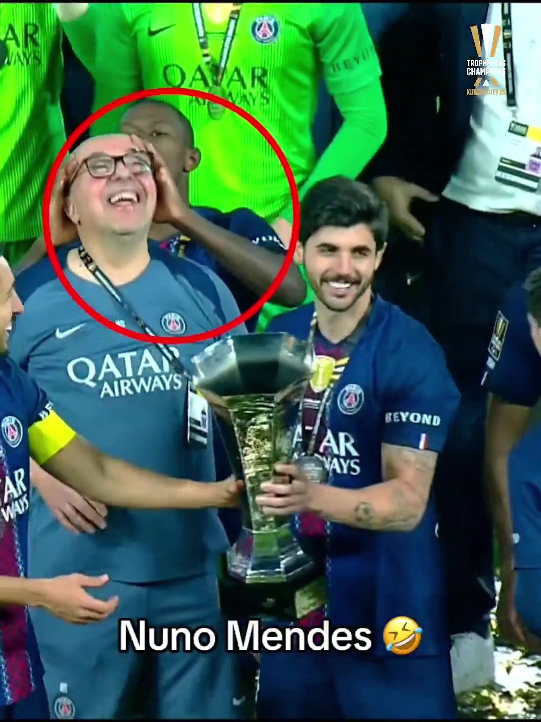 kaiyun-有趣一幕!队友捧杯庆祝夺冠,努诺·门德斯捧工作人员光头